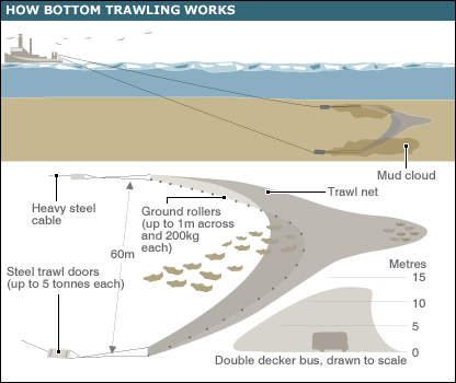 Certain types of fishing gear can damage the physical structure of marine habitats as they pass over the ocean floor. Bottom trawls used to capture demersal fish species and dredges used to capture scallops have been shown to be particularly damaging to sensitive [1].